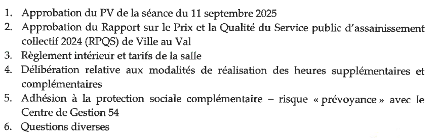 Avis aux habitantsConseil municipalNews Conseil Municipal 19 septembre 2025 Webmaster La prochaine séance du conseil municipal se déroulera , le mercredi 24 septembre 2025 à 20h, en mairie. L’ordre du jour comprendra les points suivants:
