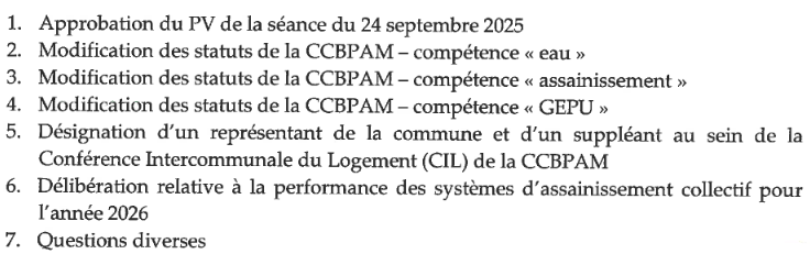 Avis aux habitantsConseil municipalNews Conseil Municipal 3 décembre 2025 Webmaster La prochaine séance du conseil municipal se déroulera: le mercredi 10 décembre 2025 à 20h, en mairie. L’ordre du jour comprendra les points suivants: